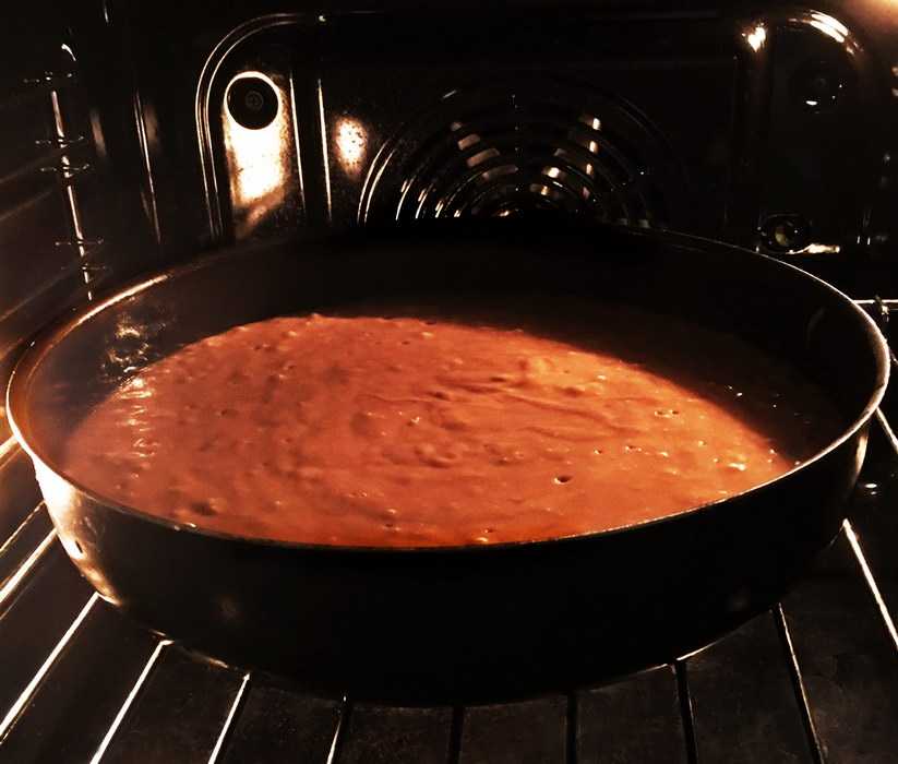 Затянуть форму листом фольги, разогреть духовку до температуры 220 градусов, поставить в нее форму с тестом. Начать проверять готовность коржа через 50 минут с помощью деревянной палочки, которую можно протыкать прямо через фольгу.