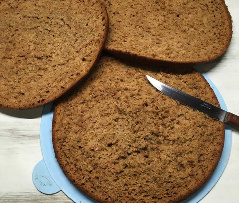 Когда корж полностью остынет, разделить его на два или три пласта.