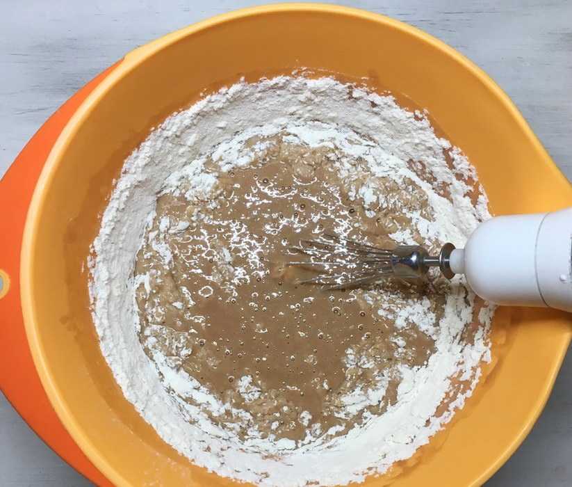 Затем в 2 этапа нужно положить в смесь просеянную муку и основательно смешать ложкой, добиваясь полной однородности.