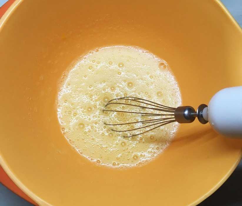 - В миску вбиваются яйца. После добавления к ним ¼ заявленного количества сметаны и ½ объема сахара продукты взбиваются при помощи миксера.
