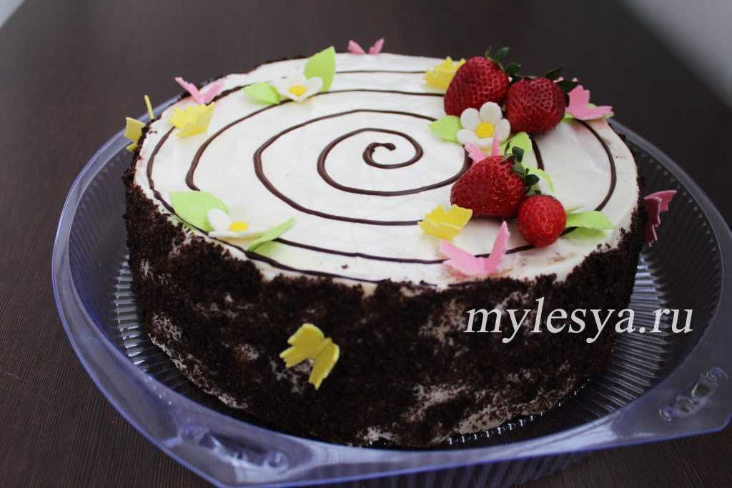 На поверхности готового торта теплым шоколадом делают рисунок в виде древесных колец при помощи кондитерского мешочка. Грибочки хаотично располагают на десерте, дополнительно украшают крошками печенья, орехами и листочками мяты. Пользуясь классическим рецептом, можно пошагово приготовить удивительный десерт в домашних условиях.