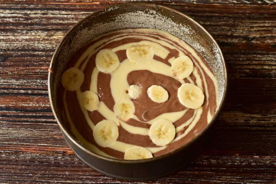 После подготовки перечисленных ингредиентов возьмите стеклянную форму для выпекания. Тщательно смажьте стенки посуды сливочным маслом. Затем обильно посыпьте пшеничной мукой. Постепенно заполните форму, наливая около 2 столовых ложек белого и темного теста поочередно. Располагайте смесь таким образом, чтобы каждая следующая порция выливалась в центр предыдущей. Когда посуда будет заполнена до краев, начинайте выпекать десерт.