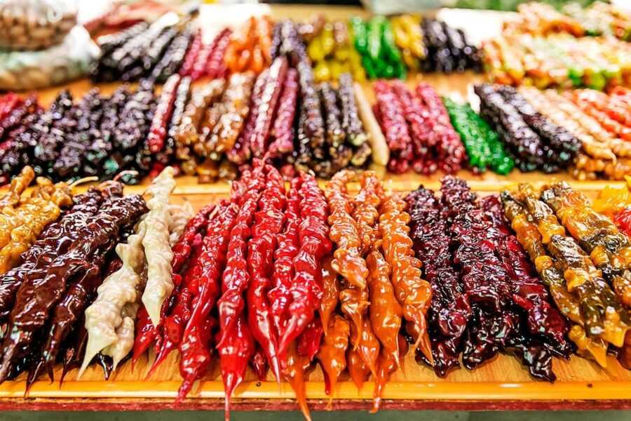 За сложным названием скрывается лакомство в форме колбаски из фруктов и грецких орехов. Другой вид десертной колбасы из сброженного винограда и орехов – пикола суджук. Производят в Турции и знаменитую среди россиян чурчхеллу.