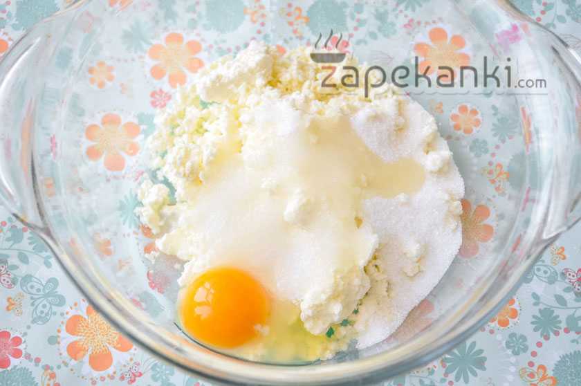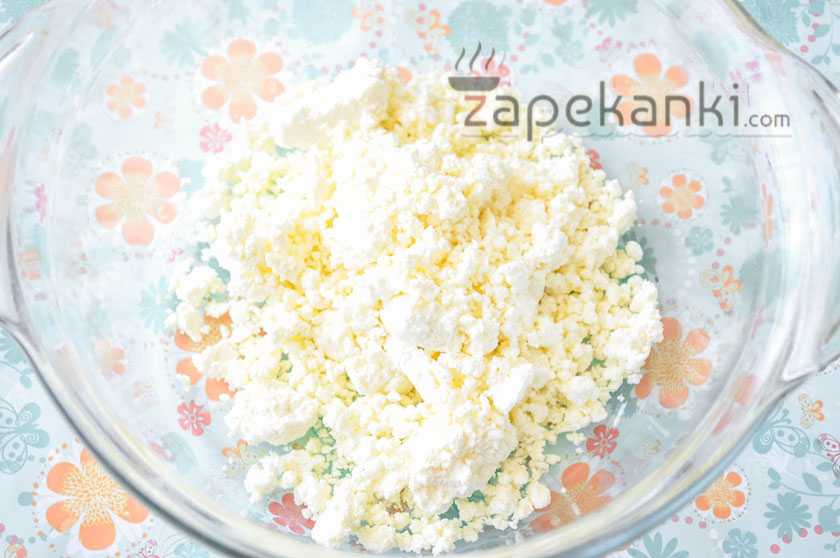 1. Учтите, если у вас довольно большая семья, тогда вам необходимо увеличить количество указанных ингредиентов минимум в два раза. В большую кастрюлю или же самую обычную пластиковую миску выкладываем творог.