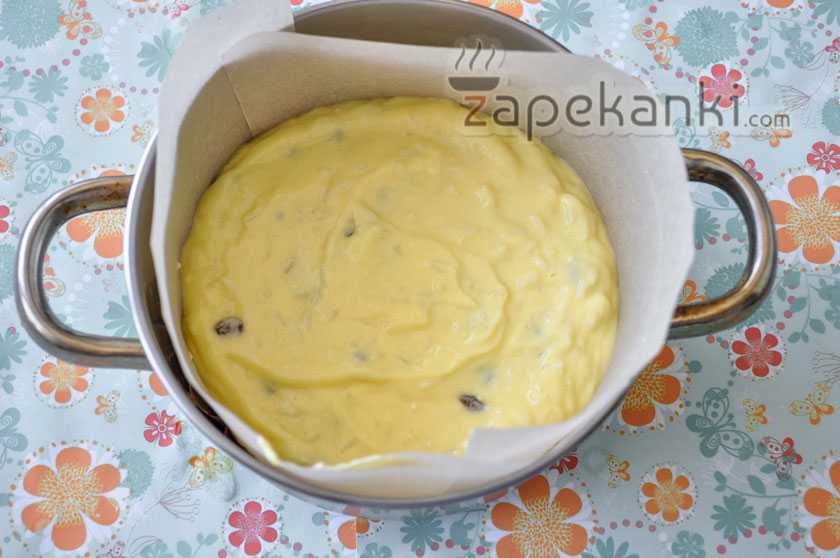 9. Подготавливаем ёмкость, в которой будем готовить запеканку. У меня это обычная кастрюля, на дно и бока которой я выложила пекарскую бумагу. Вы же можете использовать керамическую, стеклянную или же силиконовую формочки. И даже сделать порционные рисово-творожные пироженки в маленьких формах для маффинов. Форму можно просто смазать сливочным маслом, а если используете силиконовую, то предварительно выстилать или смазывать её не нужно. К ней ничего не пристаёт и легко достаётся. В емкость выкладываем полученное творожное тесто.