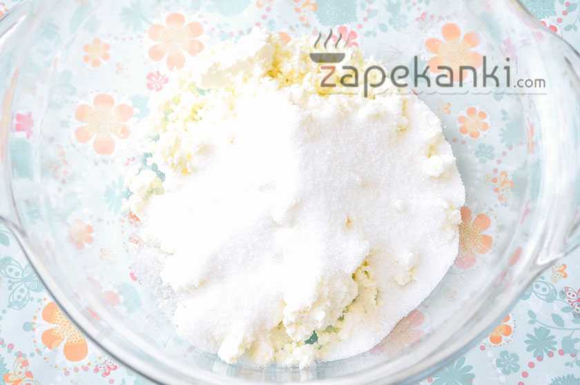 2. Добавляем к нему весь сахар. Можно, кстати, еще и ванильный сахар добавить для того, чтобы запеканка получилась более ароматной.