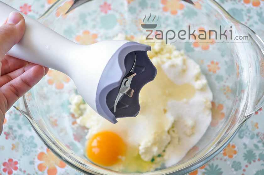 5. Блендером доводим массу до однородности, комков и творожных крупинок не должно быть. Можно предварительно творог перетереть через сито.