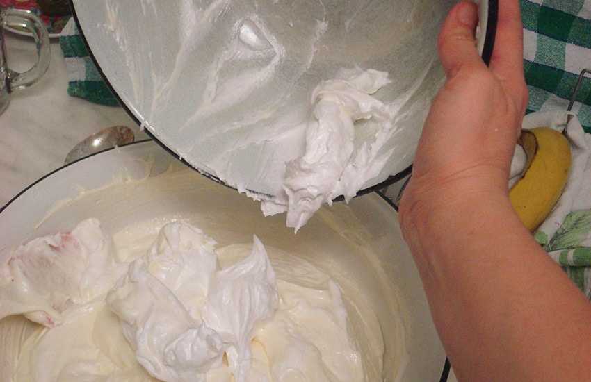 4. Белки, с помощью миксера, превращаем в крепкую пену. Перекладываем их лопаткой, в несколько подходом, старательно замешивая в тесто.