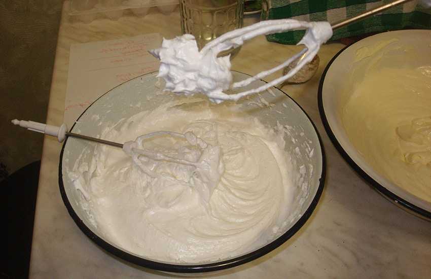 - В отдельной посуде миксером взбивают белки с сахаром до крепкой мены. Чтобы проверить, качество, переворачивают миску, и взбитые белки не выпадают.