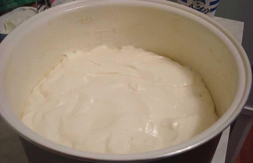 Тесто на основе творога и макарон поместите внутрь чаши, верх разровняйте ложкой.