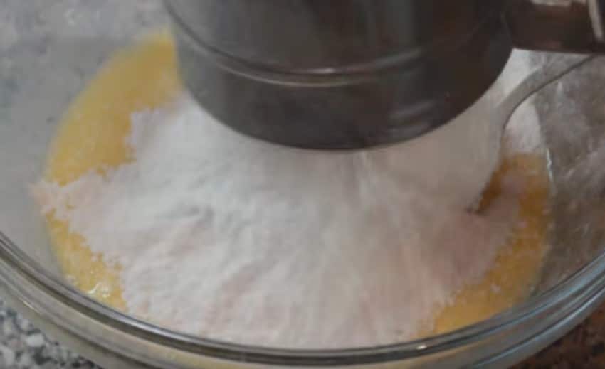 - Через сито к сливочно-сметанной смеси просеиваем 120 грамм муки и 1 чайную ложку разрыхлителя.