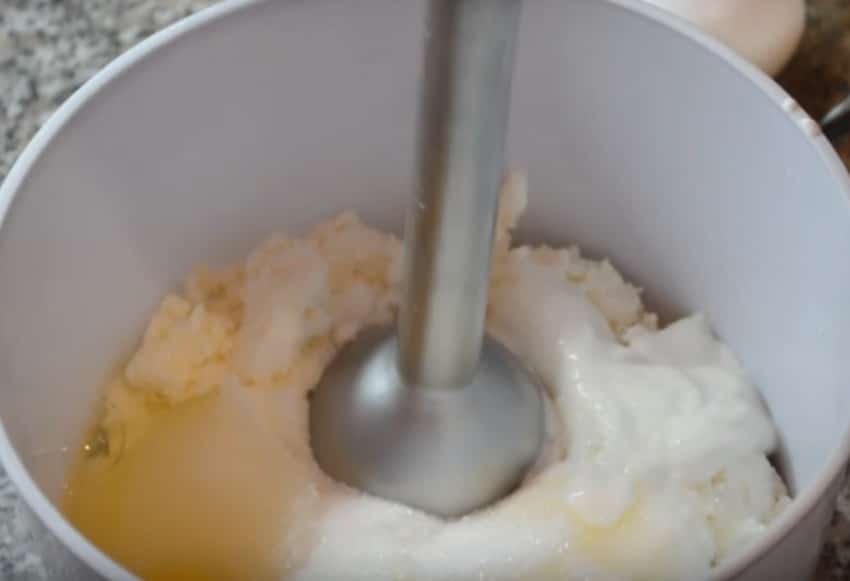 3.Теперь нужно сделать начинку. Сначала в глубокой емкости смешайте творог и яйца с помощью погружного блендера. Должна получиться гладкая, пастообразная масса без крупинок. Именно такая консистенция будет нежно чувствоваться в вишневом пироге.