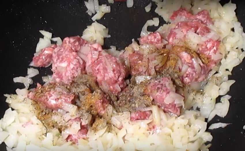 3. В сковороде разогрейте растительное масло и обжарьте лук до мягкости. Затем добавьте говяжий фарш и ваши любимые специи. Мне нравится смесь кориандра, сухого чеснока и перцев.