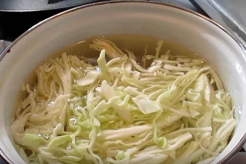 1. Белокочанную капусту необходимо предварительно пробланшировать. Для этого возьмите капусту, нарежьте её тонкой соломкой. Поставьте воду в кастрюле на огонь, доведите до кипения. В уже кипящую воду опустите нарезку и минуту дайте покипеть. Затем выключите огонь, слейте жидкость с капусты при помощи дуршлага.