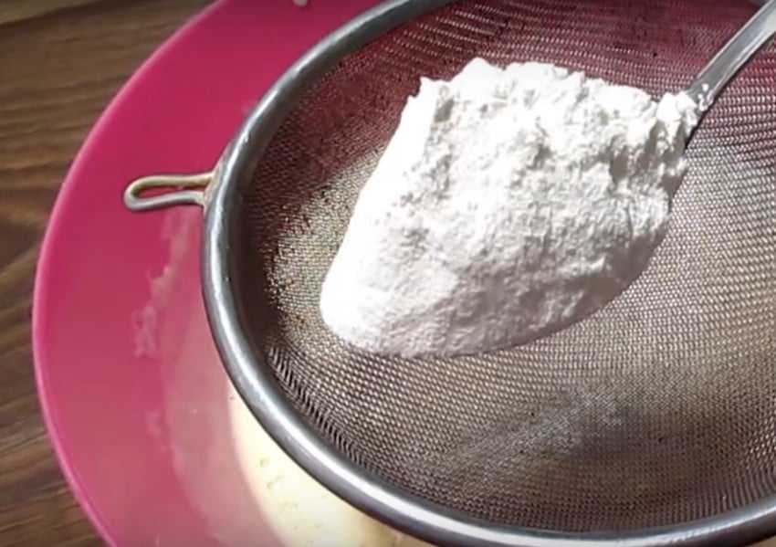 Добавьте в заготовку рыхлитель. Просейте муку. Можно использовать муку второго сорта. Промешайте массу. Должно получиться тесто без комков.