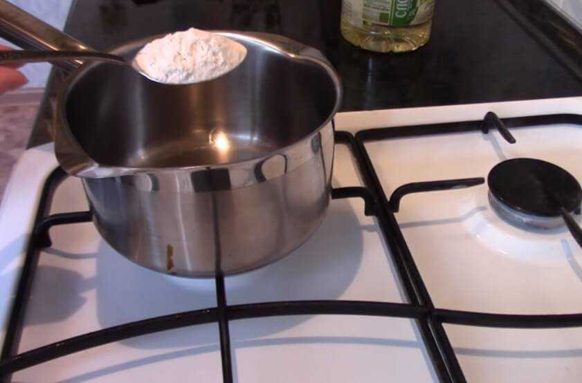 В сотейник нальем масло, хорошо разогреем его. Затем туда всыпаем 1 ст.л. муки и обжариваем на медленном огне до появления кремового цвета.