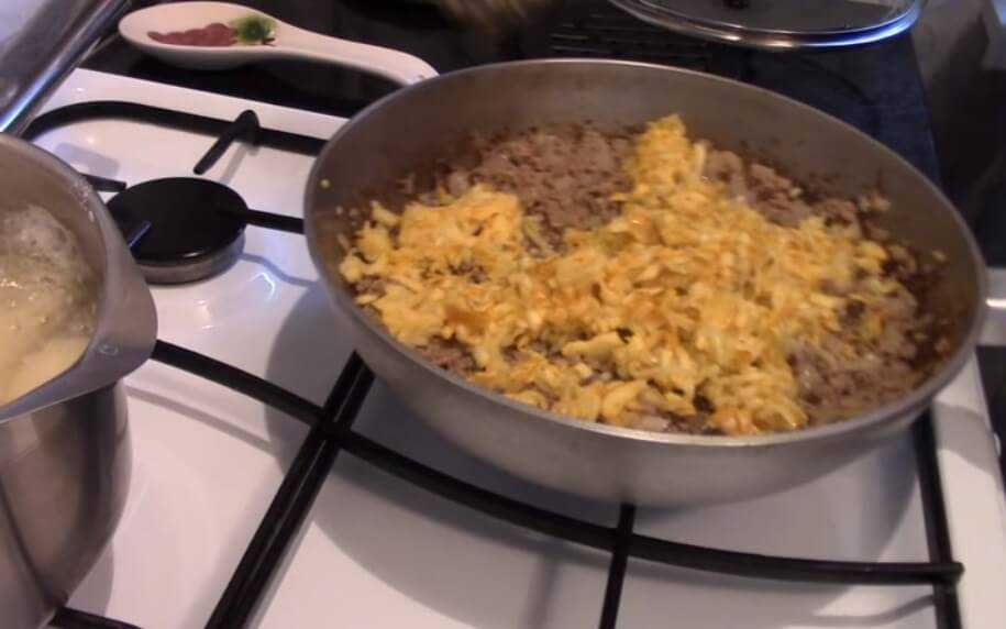Как только увидим, что лук приобрел нужный нам цвет, выкладываем к нему фарш и обжариваем на среднем огне минут 5.