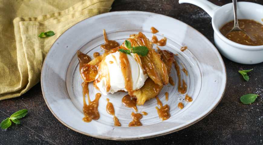 Подается такой десерт горячим, и непременно дополняется мороженым. Только представьте, мягкие ароматные бананы в горячей обжигающей карамели, холодное мороженое…