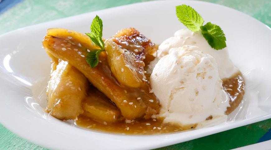 - Готовые бананы выкладываем на тарелку и посыпаем кунжутом. Вкуснее всего подавать такую вкусняшку с кусочком или шариком любимого мороженного или со взбитыми сливками. Остатками карамели можно полить все сверху тонкой струйкой, чтобы не сильно растопить мороженое.