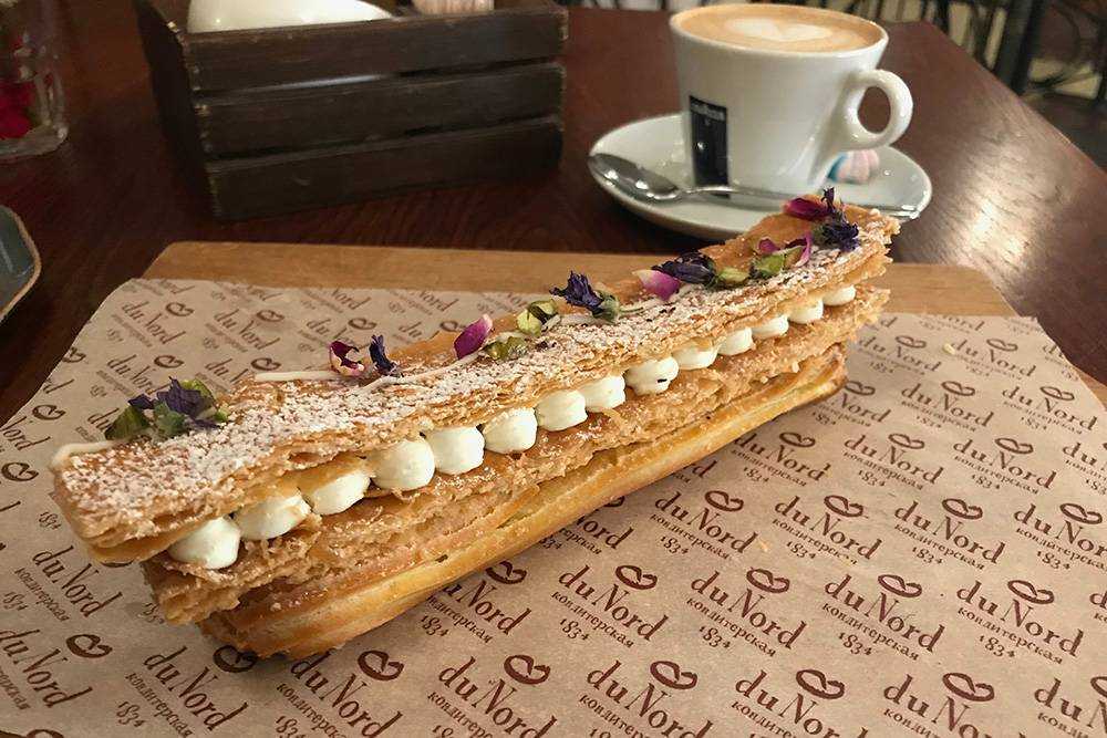 Du Nord — еще одно несетевое заведение. В Петербурге всего две таких кондитерских: на пересечении Лиговского и Невского проспектов и в районе метро «Чернышевская». Du Nord на Лиговском находится напротив Московского вокзала и работает круглосуточно. Сюда удобно зайти с поезда или перед ним. Кроме выпечки и тортов, есть полноценное меню с закусками, супами, горячими блюдами.