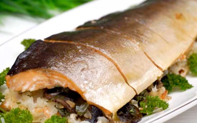- Противень достать, рыбу перевернуть, смазать другую сторону оставшимся соусом и снова поставить в духовку на 15 минут. Фаршированная горбуша готова к употреблению. Нарезать и подавать на стол только в охлажденном виде.