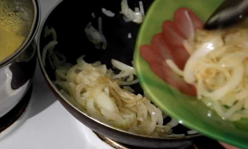 - Все овощи чистятся. Нарезанный тонкими полукольцами лук обжаривается в раскаленном масле с морковкой, измельченной на мелкой терке. Овощи обжариваются до тех пор, пока не будут полностью готовы.