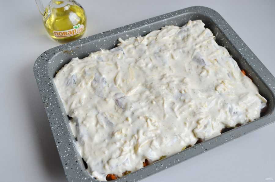 - Сверху располагают лук, морковь и картошку. Поверхность смазывают остатками майонеза.