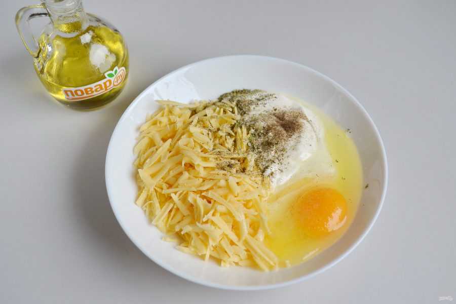 3. Для сырно-сметанной заправки соедините следующие продукты: тертый сыр, сметану, сырое яйцо крупное, соль, перец, любимые специи. Я положила тимьян, базилик.