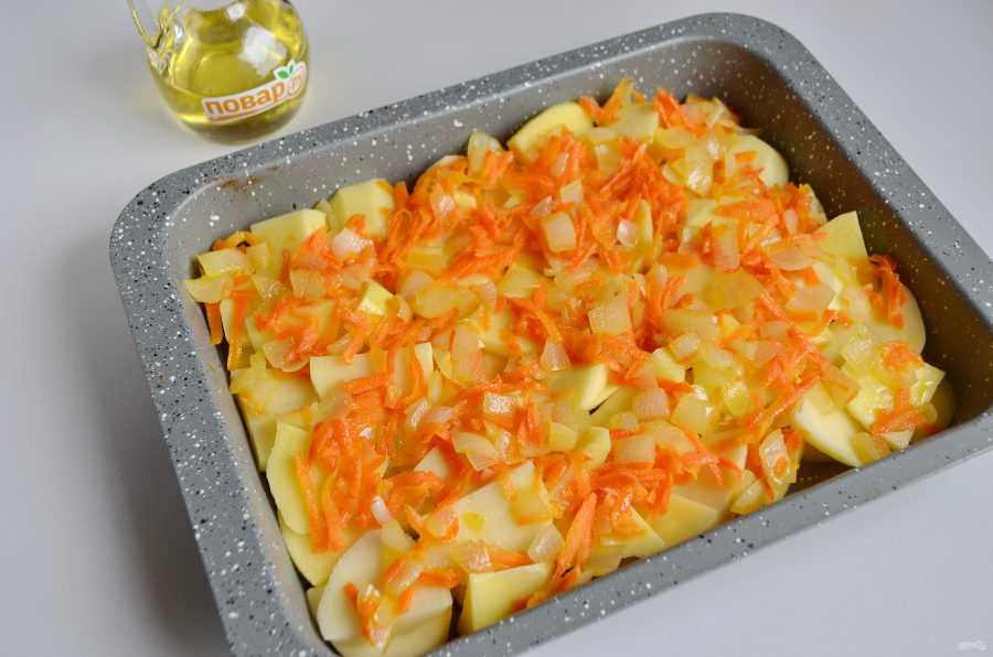 Накройте его равномерным слоем жареным луком с морковью.