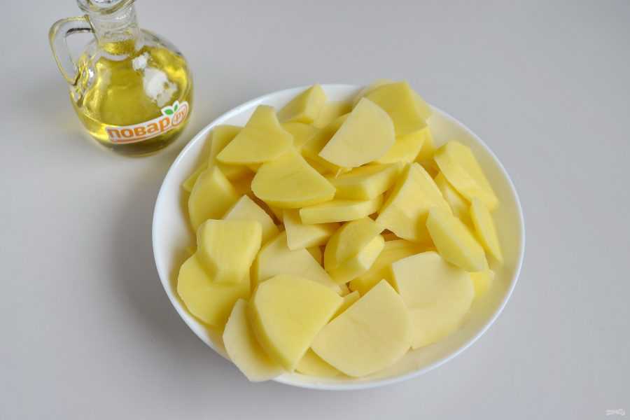 Картошку нарежьте тонкими дольками как для приготовления жареной картошки.