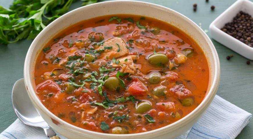 Пикантный привкус блюду придают оливки, аромат – горбуша, а благодаря рису суп получается наваристым.