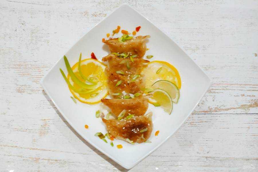 - Готовые гедзе рекомендуется посыпать кунжутом и мелко нарезанным зеленым луком и подавать с соусом.