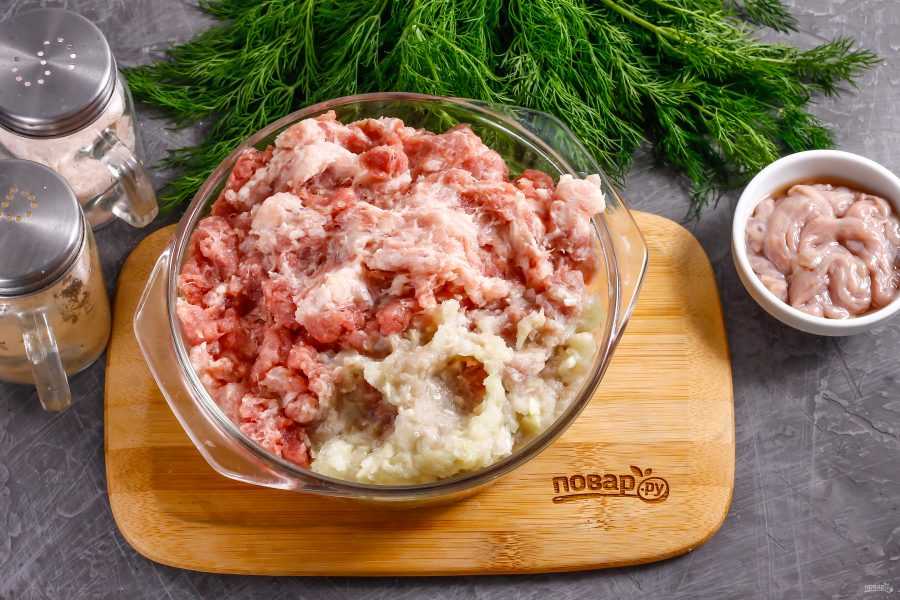 Свинину, грудинку и говядину пропустите через мясорубку.