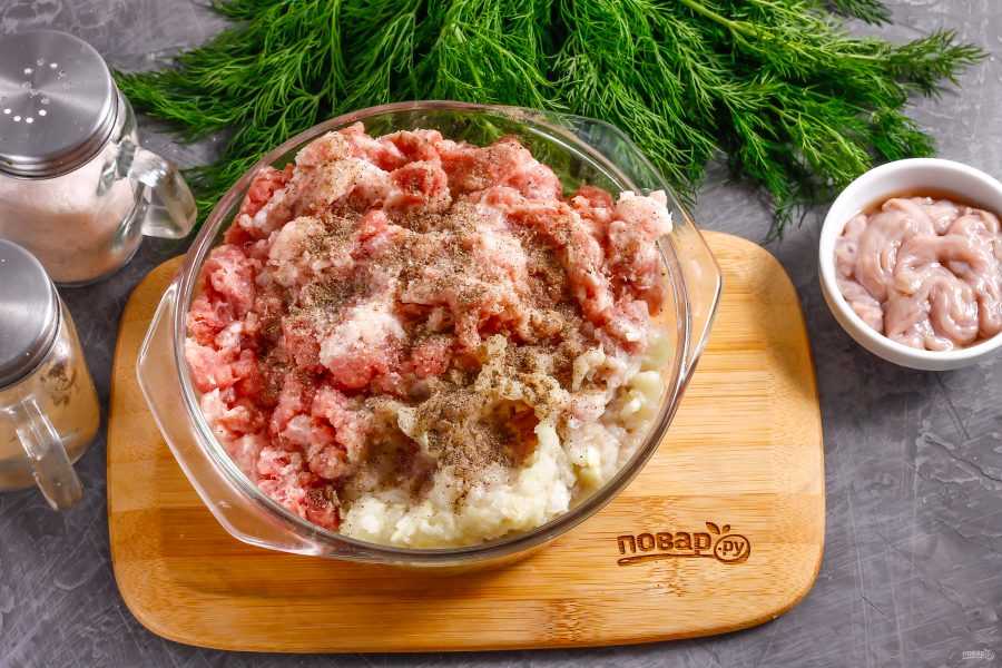 В фарш добавьте зелень (её предварительно нужно вымыть и порубить), соль, мускатный орех и перец, всё хорошо перемешайте.