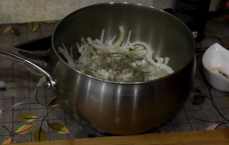 - В отдельную емкость помещаем мелко нарезанную свежую луковицу, заливаем ее кипящим бульоном и накрываем крышкой. Когда лук запарится, добавляем в него немного чёрного молотого перца.