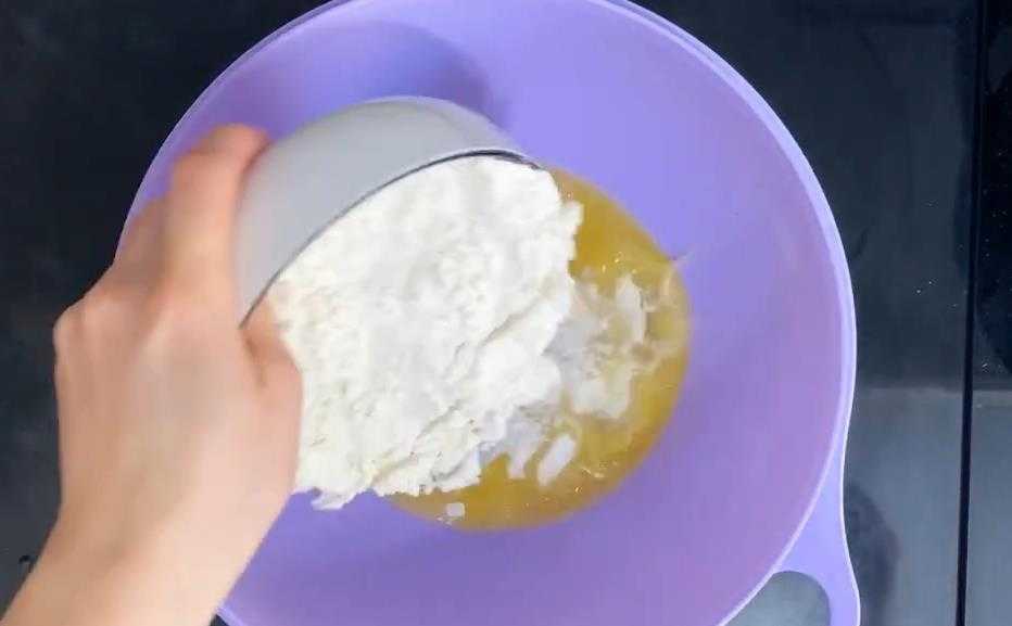 Всыпаем просеянную муку и замешиваем тугое тесто. Заворачиваем его в пищевую пленку и убираем на полчаса в холодильник.