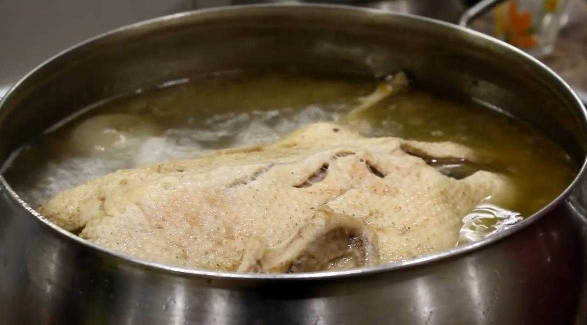 Отварить промытую утку и казы в холодной воде в течение 2 часов, добавив в нее луковицу. За 20 минут до готовности посолить жидкость.