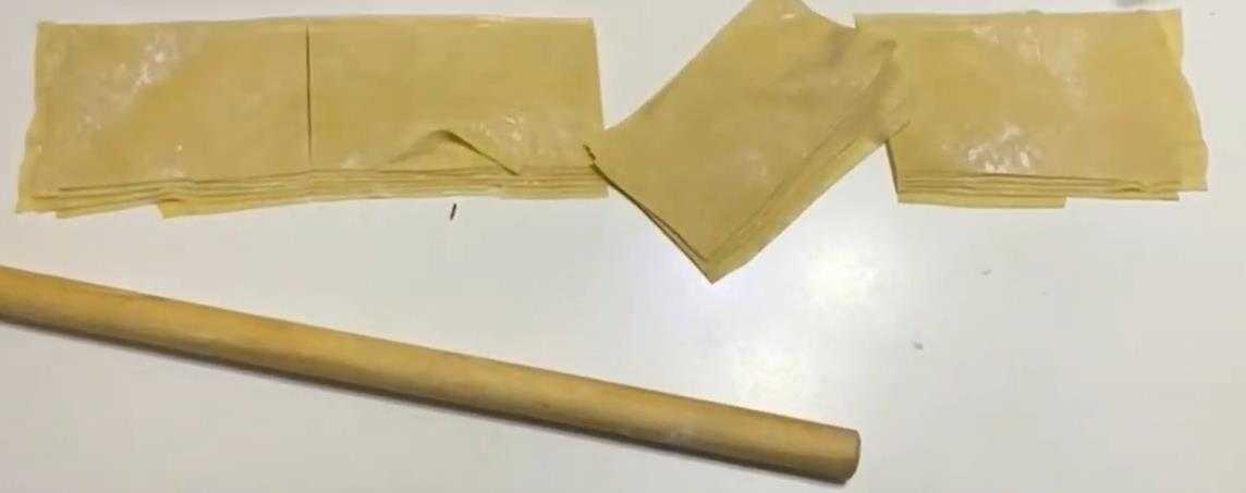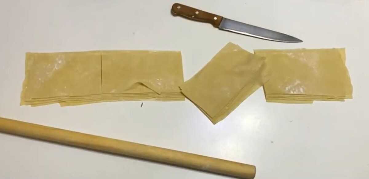 Одновременно необходимо сделать тесто из муки, воды и яиц, добавить соль и оставить на 40 минут. После этого оно раскатывается до очень тонкого состояния. Затем требуется нарезать мясо на большие квадратные кусочки.