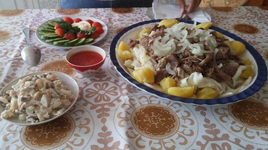В Казахстане до сих пор бешбармак принято есть руками – при помощи всех десяти пальцев. Таким же образом употребляют праздничную еду узбеки и таджики, не отступая от своих национальных традиций. Бешбармак, кстати, может готовиться с добавлением на блюда отварного картофеля. Основа – баранина и крупные, но тонкие квадраты домашнего теста. Лапша, правда, совсем не похожа на макаронные изделия в их привычном понимании. По сути, лапша — это тонко раскатанные клецки в форме ромбов.