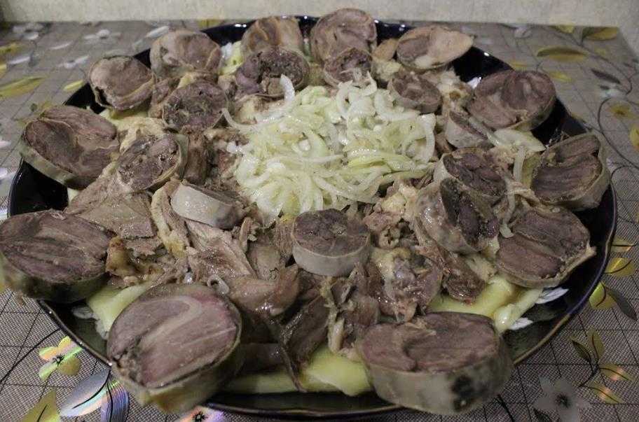 - Нарезаем их ножом на крупные ромбы (10 х 10 см), сверху по краям блюда укладываем мясо и поливаем горячим бульоном. Лук подается отдельно.