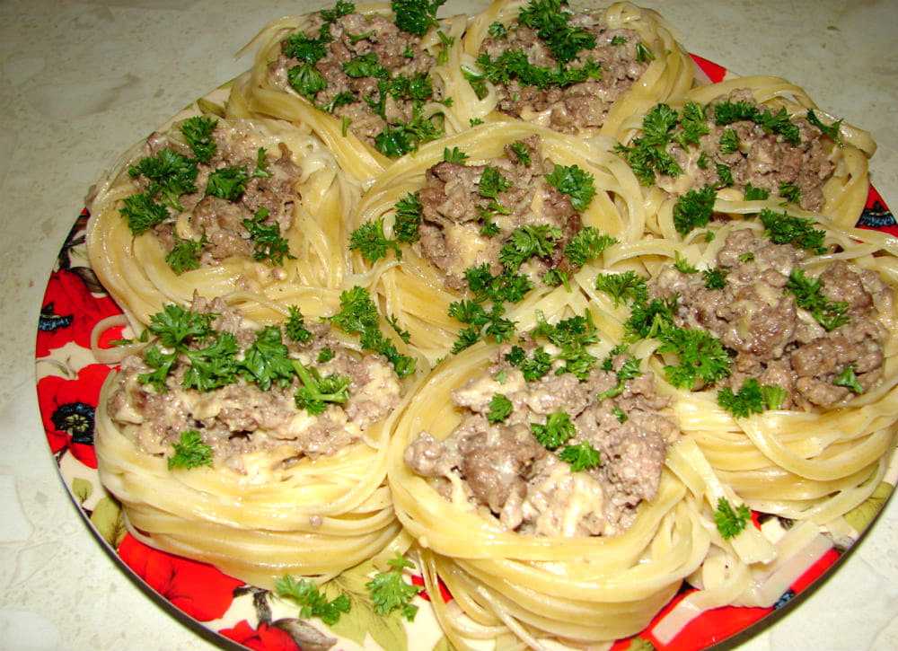 Если в морозилке есть немного фарша, а в кладовке – упаковка макарон-гнезд, то хозяйке всегда будет чем удивить неожиданных гостей. Эффектная порционная подача этого вкусного и аппетитного блюда приходится всем по душе.