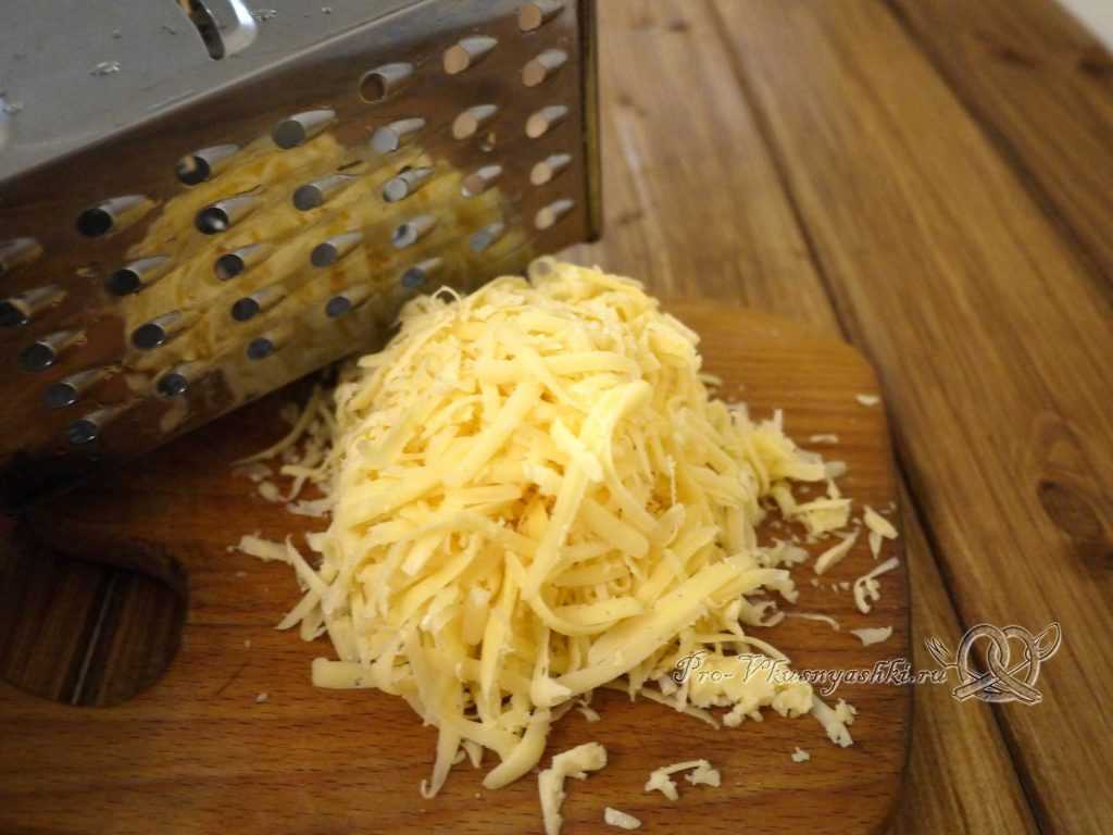 - Нашинковать лук с чесноком. Обжарить вместе с фаршем. Натереть сыр.