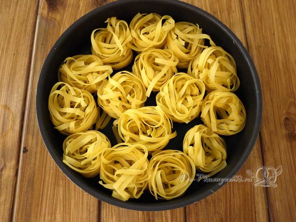 Гнездышки рекомендую брать готовые (например, Макфа) — это значительно упрощает процесс приготовления. Но можно сделать их самостоятельно, скрутив из спагетти, вермишели, макарон.