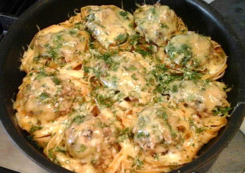 - Гнезда (8-10 штук) выложить в сковороду, начинить мясной массой.