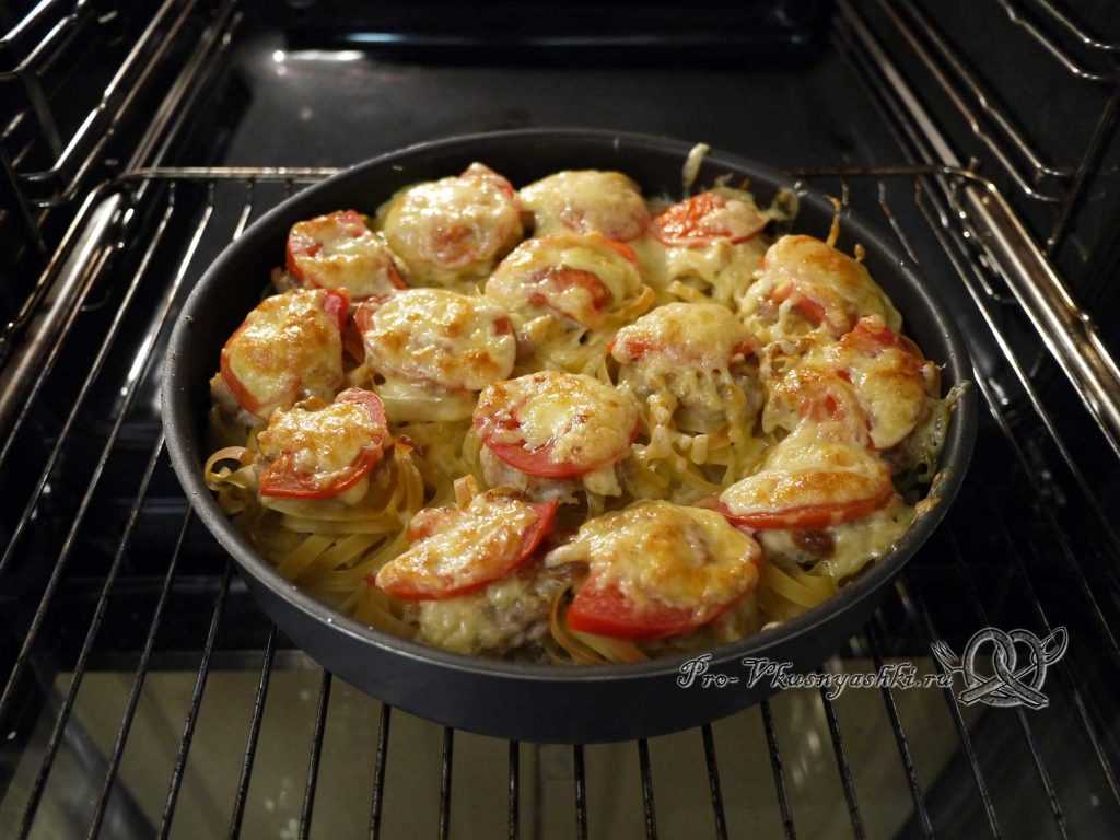 Для начала макароны отвариваются, затем в гнёзда укладывается фарш. Всё заливается соусом из обжаренной моркови с луком, сметаной и кетчупом. Форма накрывается фольгой и за 10 минут до конца приготовления, макароны с фаршем посыпаются сверху сыром.