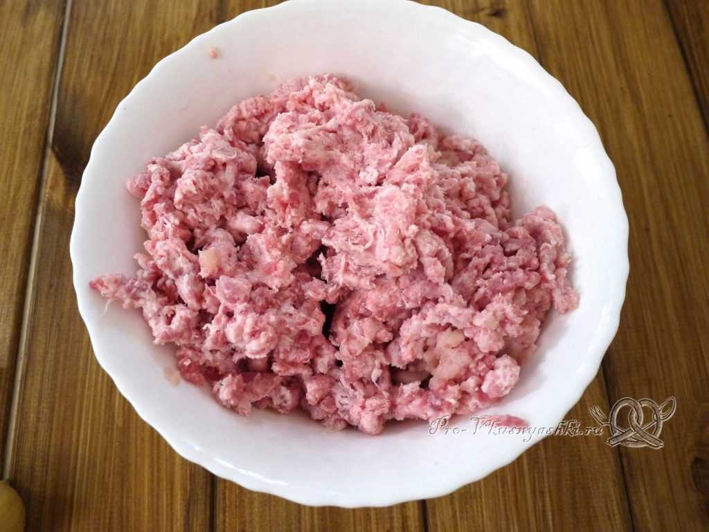- 500 г свино-говяжьего фарша соединить с измельченной луковицей, солью, перцем. Вымешать состав.
