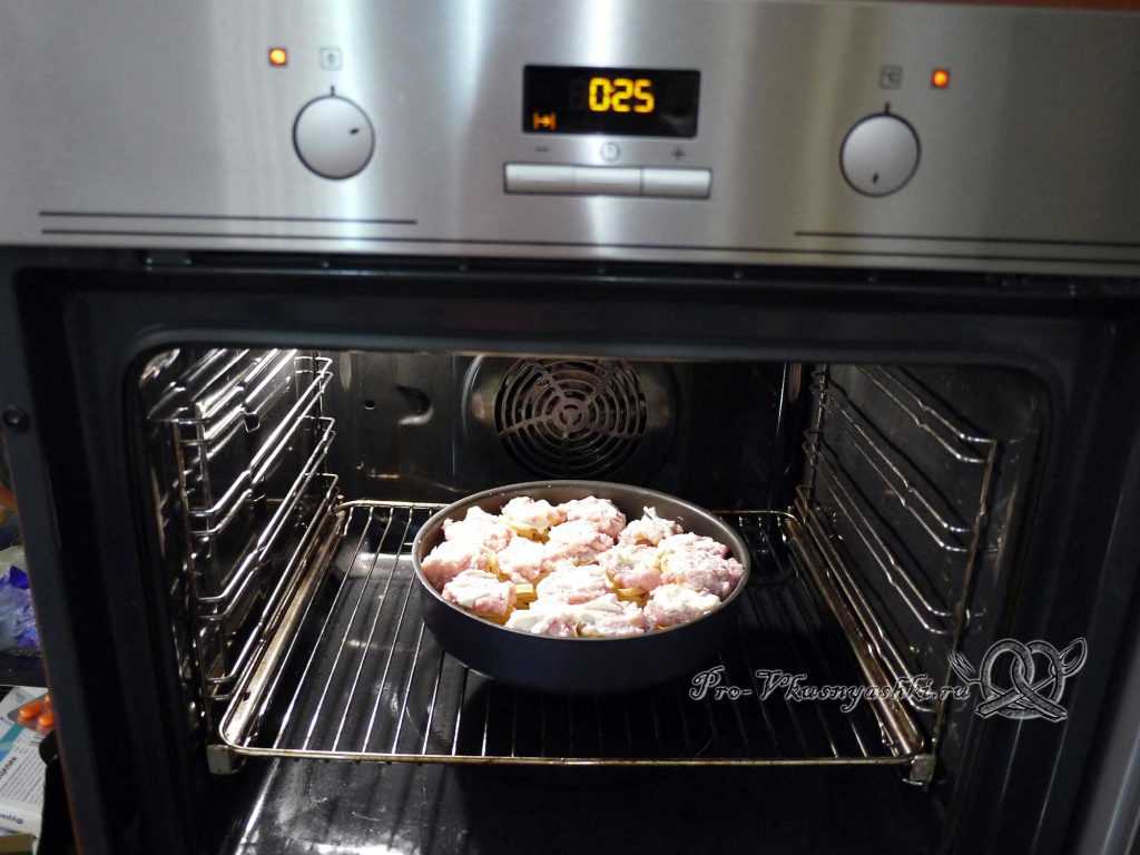 3. Гнезда выложи в форму, скатай мясные шарики и разложи в них же.