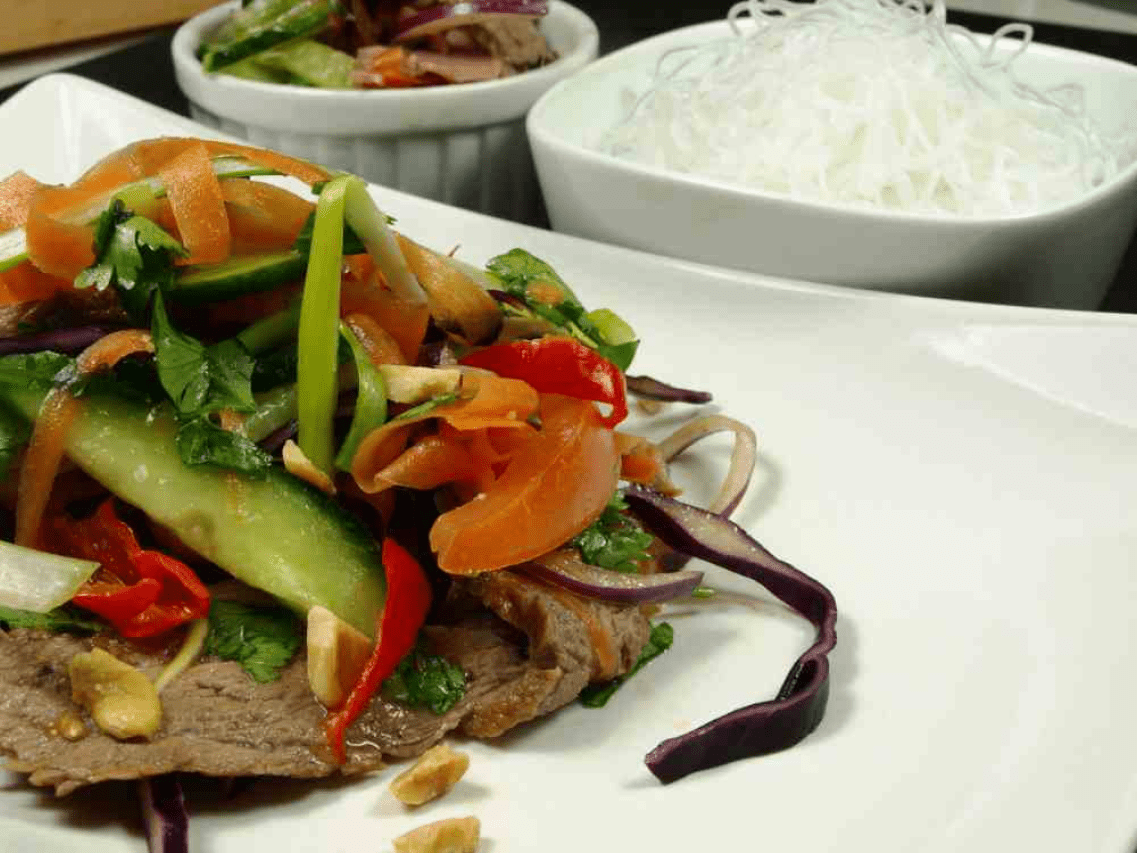 - Мясо по-тайски подать к отварному рису и овощному салату.