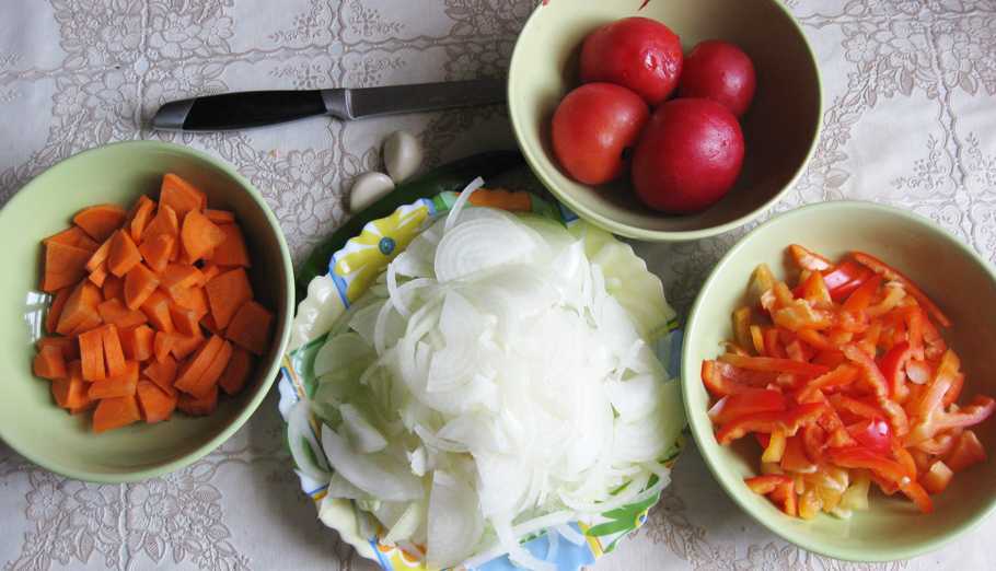 В этом блюде будет много овощей, так что приготовьтесь поработать ножом. Нарезаем: лук — кольцами, кабачок — дольками по 0,5 см шириной, картофель — крупными кубиками, баклажан — круглыми кусочками по 0,5 см толщиной, морковь — соломкой, перец — дольками, мясо- порционными кусками по 5-6 см, помидоры — дольками.
