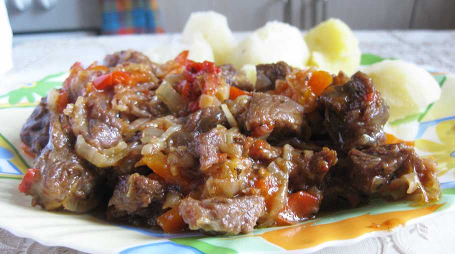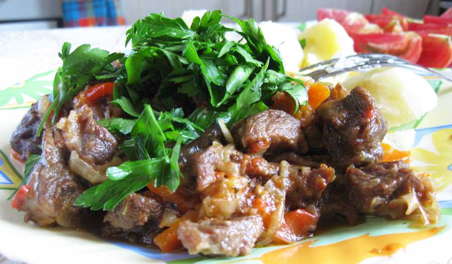 Для приготовления тушеной говядины в казане нам понадобится сковорода и, конечно, сам казан. Нарезаем мясо на небольшие кусочки и обжариваем их на раскаленном масле. Обычно кусочков мяса получается слишком много, чтобы за один прием все их обжарить. В этом случае нам понадобится отдельная сковорода для обжарки. Итак, обжаренное мясо выкладываем в холодный казан. Далее на той же сковороде обжариваем лук и тоже выкладываем поверх мяса. Заливаем все это водой, а лучше бульоном и закладываем нарезанные болгарские перцы и морковь, чеснок по вкусу и стручок острого перца. Доводим все до кипения и тушим с закрытой крышкой около часа.